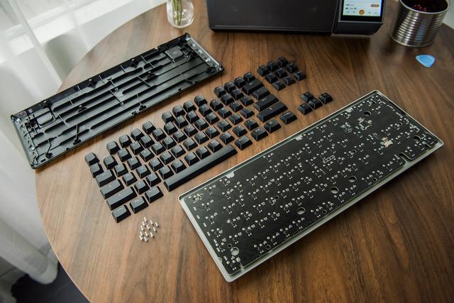 将键帽拔掉后各个螺丝位就十分较着了,拿起螺丝刀拆卸就好,底盖取面板一共通过12枚螺丝链接此中还有一些卡扣,因为富勒G87采用的悬浮式按键设想,因而红轴取PCB之间还隔着外露的铝合金上盖,这明显是一项很是复杂且没有需要的体力活,因而拆解就到这里了。